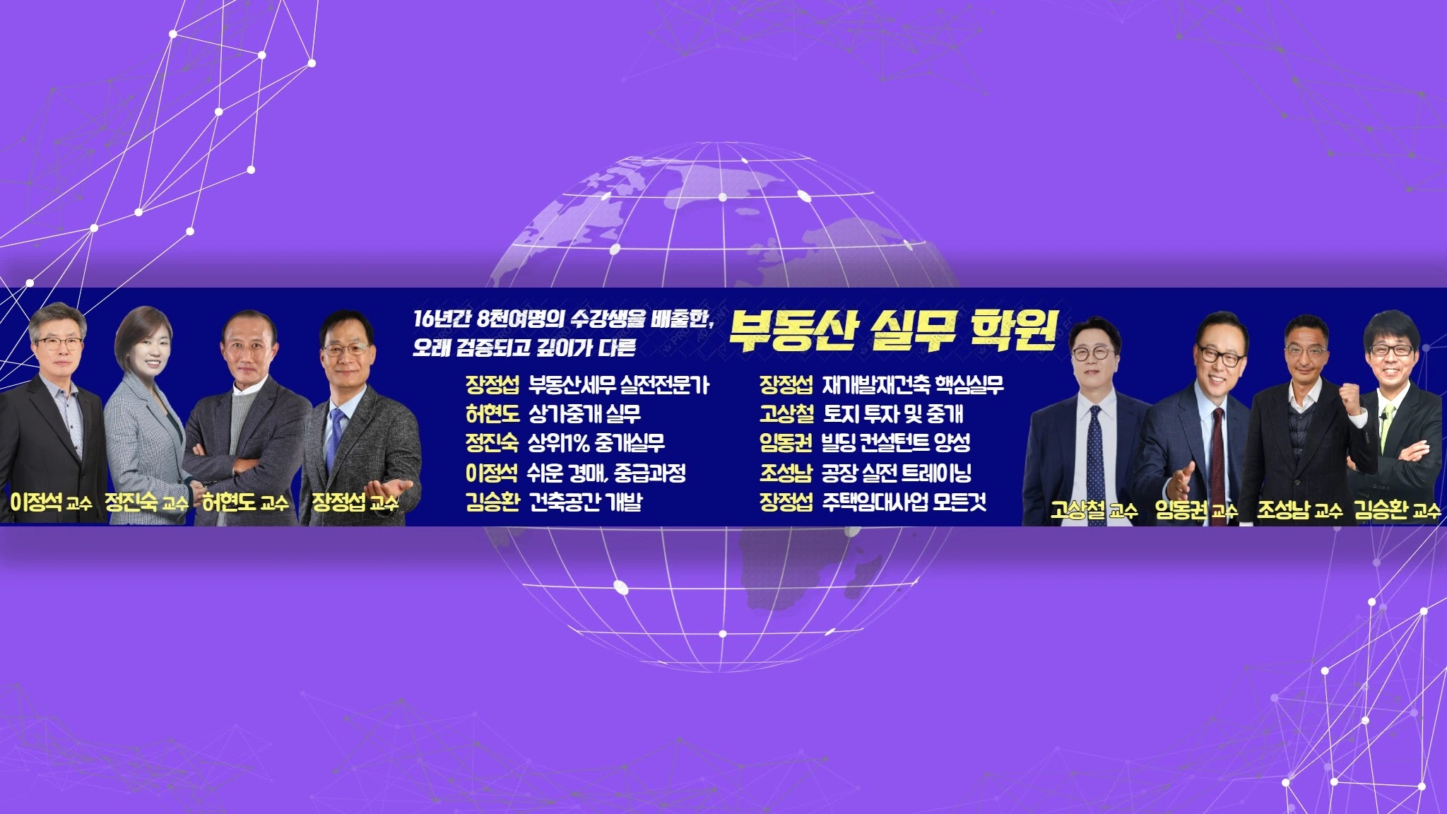 문의 : 010-3385-8733 교육장 : 서울 서초구 서초중앙로 20길15. 3층 모두가 인정하는 국내 최정상 실전 전문가가 진행하는 부동산 현장에서 꼭 필요한 실전 강좌를 엄선하여 개강 합니다. (개강 과목) 장정섭 실전 부동산 세무 장정섭 재개발 재건축 핵심 실무 장정섭 주택임대사업의 모든것 허현도 실전 상가중개 고상철 토지 투자와 중개 임동권 빌딩전문 컨설턴트 양성과정 정진숙 상위 1% 중개실무 김승환 건축 공간개발 이정석 쉬운 부동산경매, 중급과정 조성남 공장 투자와 실전 트레이닝 과정 정민호 도로 완전분석